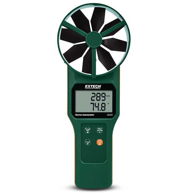 The AN300 is a large vane CFM/CMM thermoanemometer. This meter monitors air velocity, airflow, and temperature. Extech's Large Vane Thermo-Anemometer series provides more precise readings for larger ducts. Each meter shows both airflow (or air velocity) and temperature. Comes with 4 AAA batteries and a sturdy carrying case.